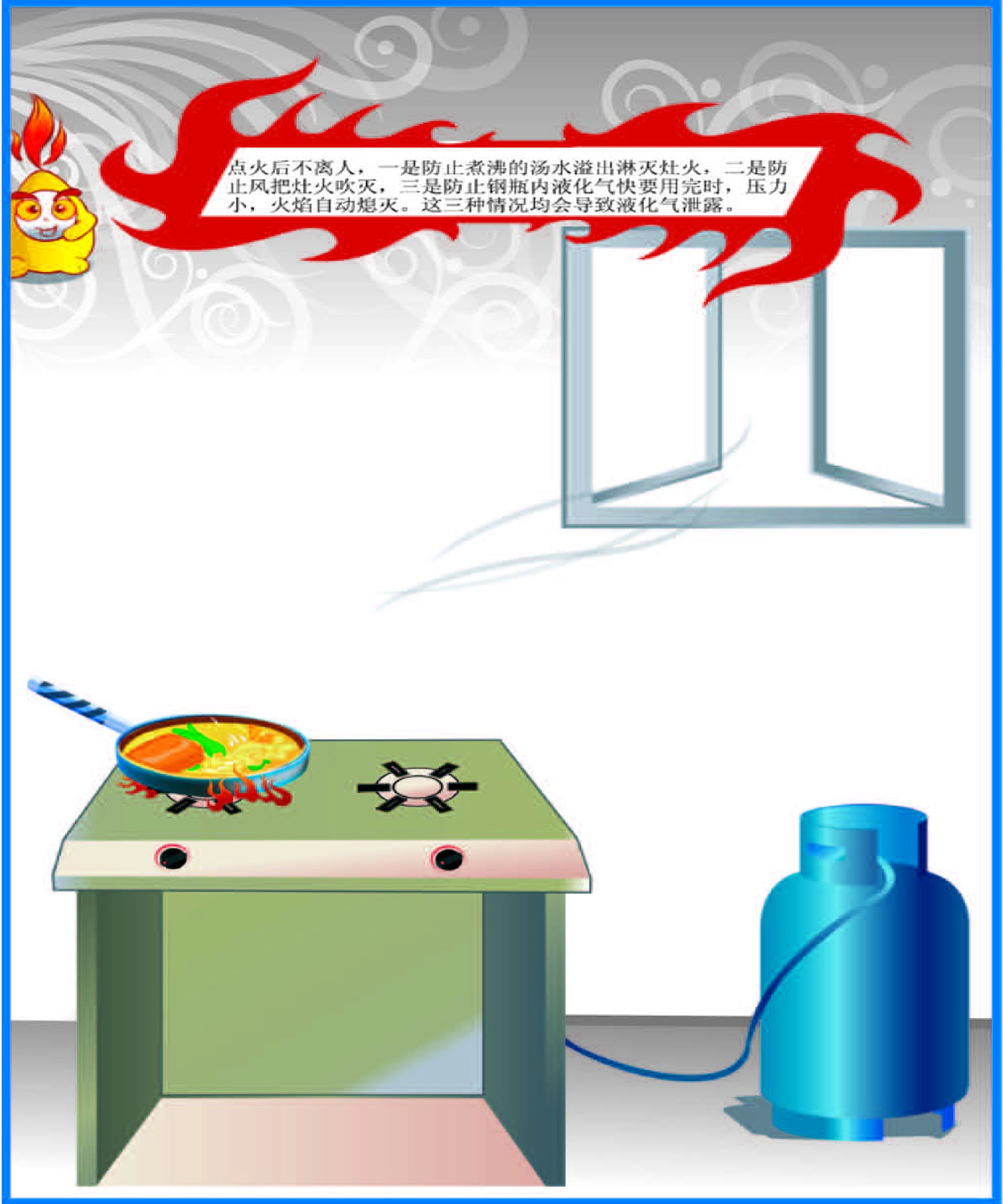点火后不离人,一是防止煮沸的汤水溢出淋灭火,二是防止风把灶火吹灭,三是防止钢瓶内野花气快要用完时,压力小,火焰自动熄灭。这三种情况均会导致液化气泄漏。